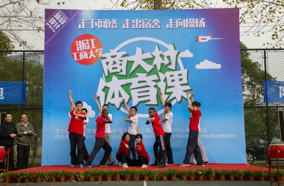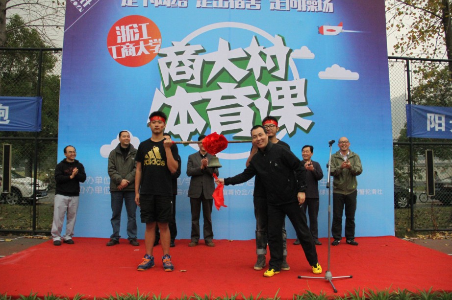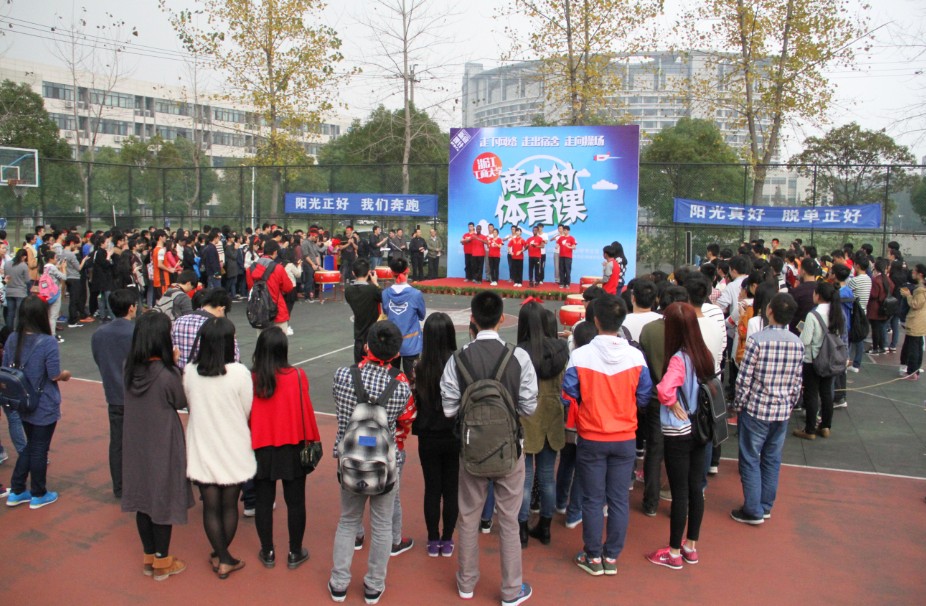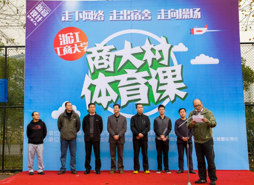 为贯彻落实中央关于“强化体育课和课外锻炼,促进青少年身心健康、强健体魄”的精神,在校团委、校学生会以及相关职能部门的部署下,浙江工商大学“走下网络、走出寝室、走向操场”三走活动“商大村体育课”于11月11日下午在下沙校区中篮球场隆重开课。浙江工商大学党委副书记李金昌,共青团浙江省委常委、学校部部长陈继胜,省学联第二十三届执行主席施少东,校学工部部长金锦华,校研工部部长葛亚宇,校团委书记何波,校体工部副部长沈建国,校后勤服务中心副主任狄云生,以及各学院分管学生工作的党委书记、副书记,团委书记和来自全校的400余人同学参加了此次活动。