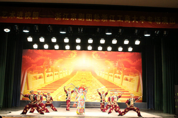 12月1日晚,“高雅艺术进校园”系列活动之《国色天香》浙江京剧团专场演出在我校学生活动中心剧院举行。600余名师生共同欣赏了京剧表演艺术家们带来的视听盛宴。演出以戏曲艺术秀的《国色天香》拉开序幕,演员身穿华服粉墨登场,经典的梅派唱腔一亮嗓便赢得了观众们热烈的掌声。整场演出曲目丰富、形式多样,生、旦、净、丑轮番献艺,唱、念、做、打样样精彩,《夜深沉》、《沉香盗灯》、《锁麟囊》、《铡美案》等京剧名段的表演引得观众叫好连连。更有现场互动环节:京剧团的艺术家们亲自示范,教同学们学习京剧表演动作。近距离的接触京剧表演,使同学们在激动兴奋之余,也体会到艺术家们在舞台上每一招每一式唯美的艺术呈现都不是一蹴而就的。随后演出的压轴节目《战金山》片段,演员们精湛的武戏表演更是赢得了满堂彩!观众们报以热烈的掌声感谢浙江京剧团的表演艺术家们的精彩表演。