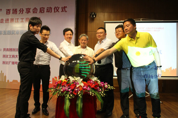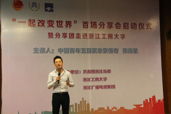 5月26日下午,由团省委主办,浙江工商大学、浙江广电集团承办的“一起改变世界”百场分享会启动仪式暨分享团走进浙江工商大学活动在我校下沙校区综合楼二楼报告厅举行。共青团浙江省委副书记朱斌,浙江工商大学党委副书记陈寿灿,第19届“中国青年五四奖章”获得者陈伟星、忻皓,2015年“浙江杰出青年”王磊,2014年度新锐浙商毛靖翔,2014年度浙江杰出志愿者顾亚海、金利宾、方明、胡吉林、罗小双、杨冬梅,浙江工商大学学生代表共约350人参加了本次活动。