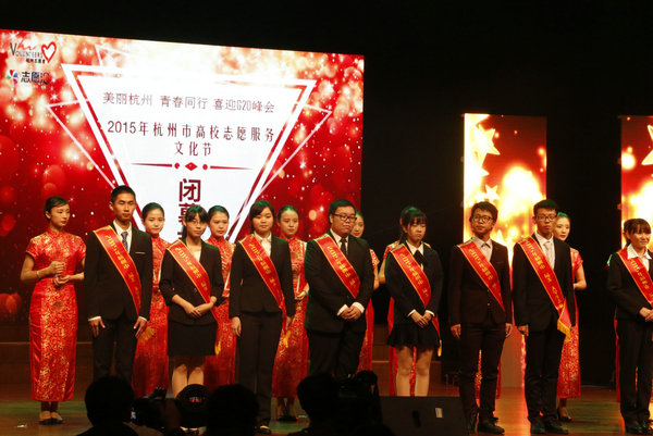 11月16日晚,由共青团杭州市委、杭州市志愿者协会、杭州青年公益社会组织服务中心、杭州高校志愿服务联合主办的2015年杭州市高校志愿服务文化节在杭州电子科技大学落幕。共青团浙江省委宣传部副部长、志工部副部长、浙江省志愿者协会秘书长储君捷,共青团杭州市委副书记、杭州市志愿者协会常务副理事长马利阳等出席闭幕式并颁奖。