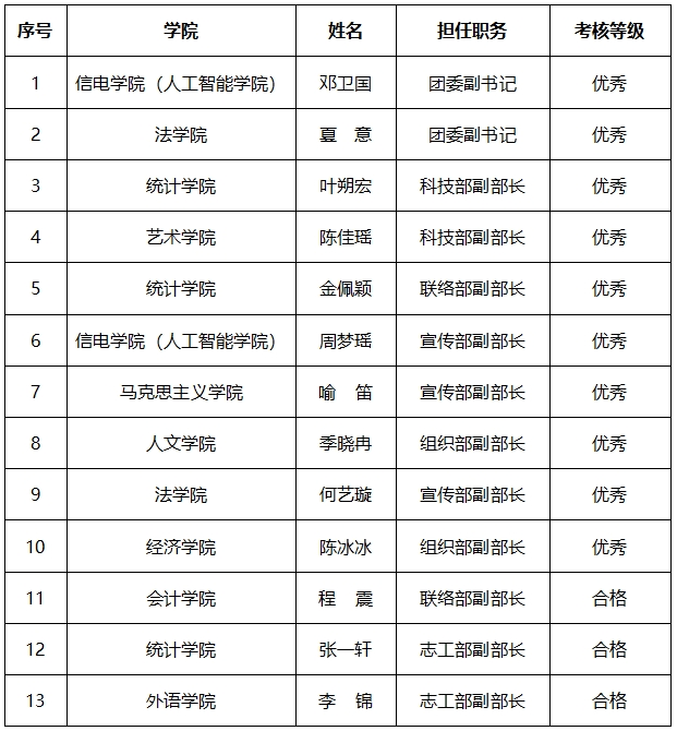 2024年-2025年,学校共选聘13名在校生担任校团委学生兼职团干部。经校团委综合评议,现将其任期考核结果予以公布。