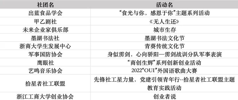 经由校团委老师、校学生社团管理中心主任团、校学生社团管理中心各部门干部以及各院社管代表投票评比,十佳社团活动最终结果公示如下: