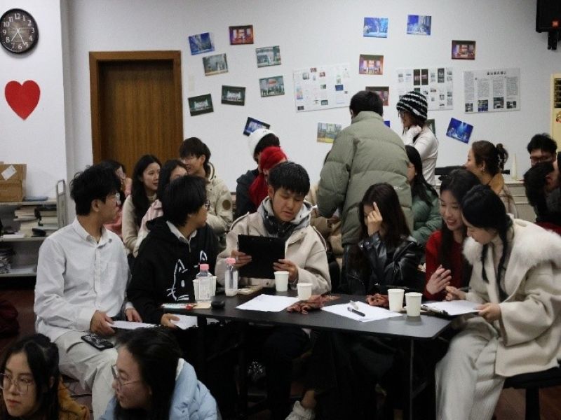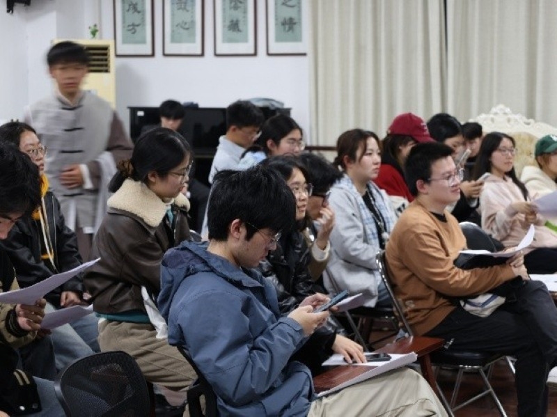 从观众到演员,从椅凳到场上,同学们踊跃参与演绎,全员一同体会戏剧的魅力。有人攥紧稿纸嘶吼“太阳升起来了,黑暗留在后面”;有人低头轻念“钱是冰冷的,爱人的手是热的”。不少同学高举双手,展现排练结果,我们看到称赞白露“美艳”“肉感”俗不可耐的顾八奶奶重现,我们看到潘月亭与李石清激烈的争吵。当掌声漫过舞台,有参与者感叹:“念出台词的瞬间,我仿佛成了戏中人”。