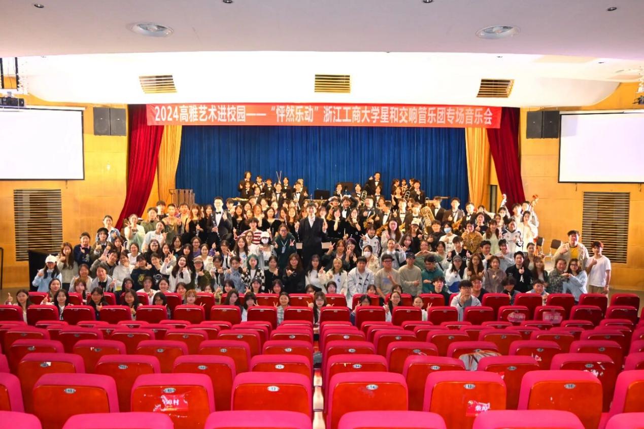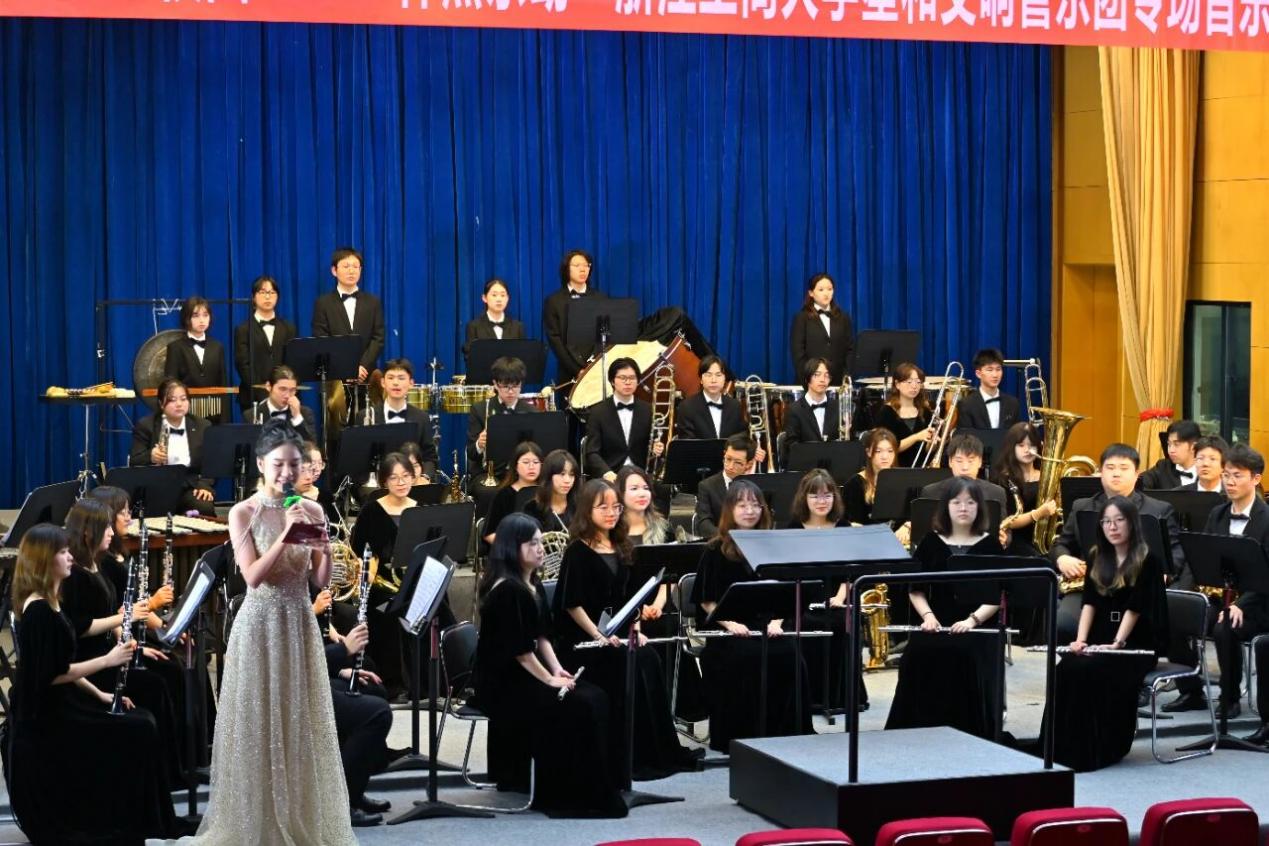 浙江工商大学党委委员、宣传部部长、统战部部长严毛新,浙江工商大学杭州商学院党委副书记章晓乐,浙江工商大学团委书记张华,两校各相关职能部门负责人和浙江工商大学杭州商学院师生共同观看演出,音乐会由浙江工商大学星和交响管乐团孙佳琪老师担任指挥。弦乐悠扬,木管清脆,每一个音符都完美地融合在一起,乐音萦绕在现场观众的心头,触动了他们最深处的情感,让他们完全沉浸于星和交响管乐的音乐世界中。