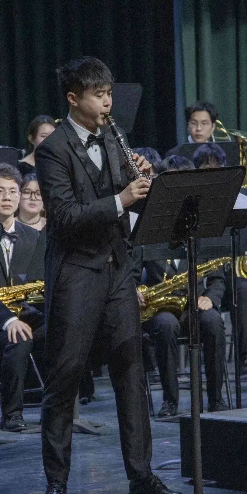下半场管乐团以管乐演奏《风暴降临》开启“世界回响”篇章,急促的节奏与厚重的音色模拟“穿越风暴”的情境。随后,《世界之巅》《出埃及记》《自由探戈》《情热大陆》《名侦探柯南》等作品接连上演,乐声带领观众“踏足”世界之巅、“回望”历史场景、“漫步”潘帕斯高原,更唤起童年回忆。演出中段,孙老师带来独奏《飞越彩虹》,细腻的演奏技巧与动人的旋律线条引发全场共鸣,成为音乐会的高光时刻之一。
