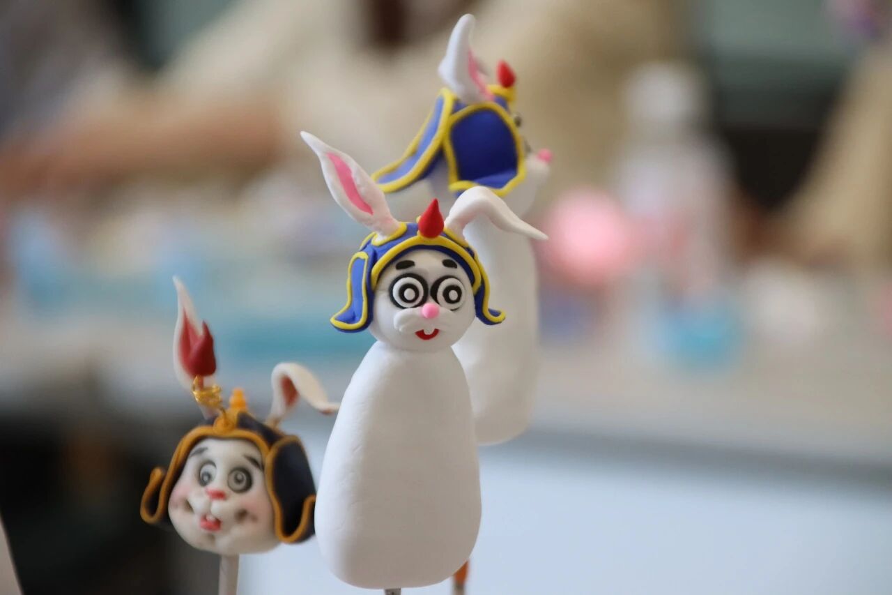 高老师一边讲述兔爷的形象特点,同时手把手指导在场的师生,用专业的手法来捏面人,在场师生亲手体验了面塑全过程,在高老师耐心的指导下,一只只活灵活现、俏皮又威武的兔爷跃然眼前。