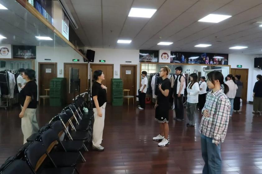 第二次团训开始时,大家在“八百标兵奔北坡”的经典台词中训练发声,在走动中寻找放松的发声方式。紧接着是一段来自北京各大景点的旅游词的小练习,通过长短句的变换,同学们逐渐熟悉了如何在长短句中偷气换气。练习虽简单,每个人却都拿出了十二分的热情,全力以赴。过程中难免遇到难题,但每一次问题的解决,都是一次悄然的进步,“小太阳”在这样的点滴积累中,慢慢蜕变。