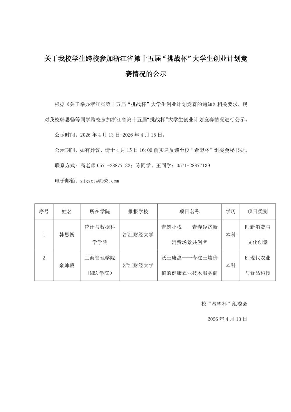 关于我校学生跨校参加浙江省第十五届“挑战杯”大学生创业计划竞赛情况的公示